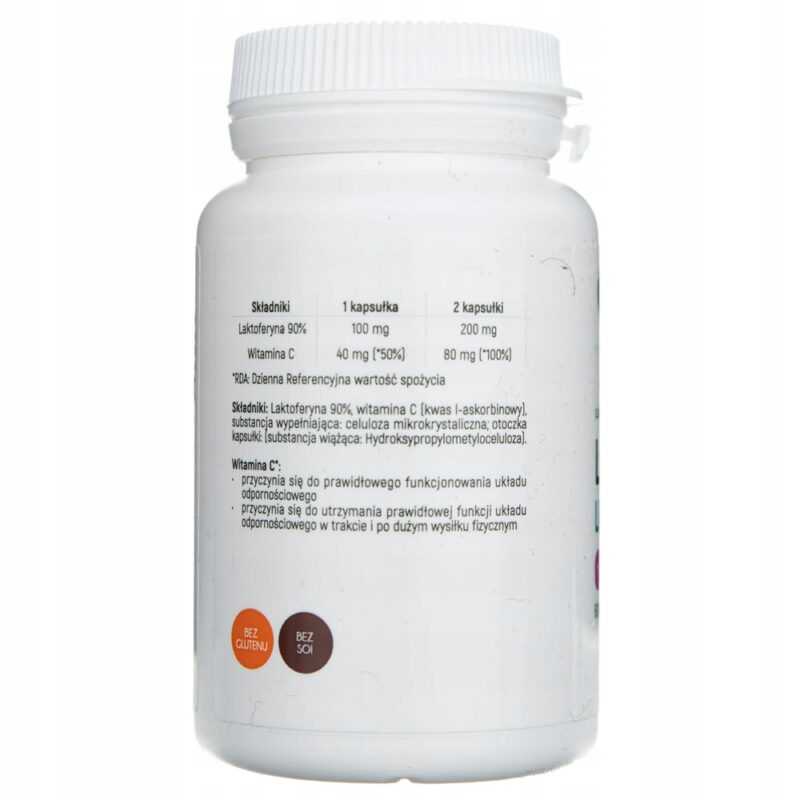Składniki: Laktoferyna 90%, witamina C (kwas l-askorbinowy), substancja wypełniająca: celuloza mikrokrystaliczna, otoczka kapsułki: (substancja wiążąca: Hydroksypropylometyloceluloza)