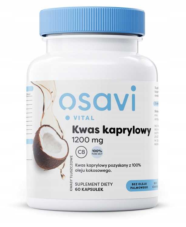 - Kwas kaprylowy pozyskany z oleju MCT produkowanego w 100% z owocu palmy kokosowej Cocos nucifera.Bez oleju palmowego, bez GMO, bez glutenu, bez laktozy, bez cukru, bez soi.W formie kapsułek miękkich łatwych do połykania.Opakowanie wykonane z BioPET (30% tworzywa pochodzi z trzciny cukrowej).