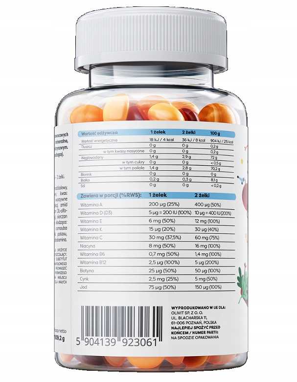 Suplement diety w postaci kolorowych owocowych żelek zawierających witaminy i składniki mineralne, o smaku pomarańczowym, malinowym i cytrynowym. Bez dodatku cukrów (zawiera substancje słodzące).