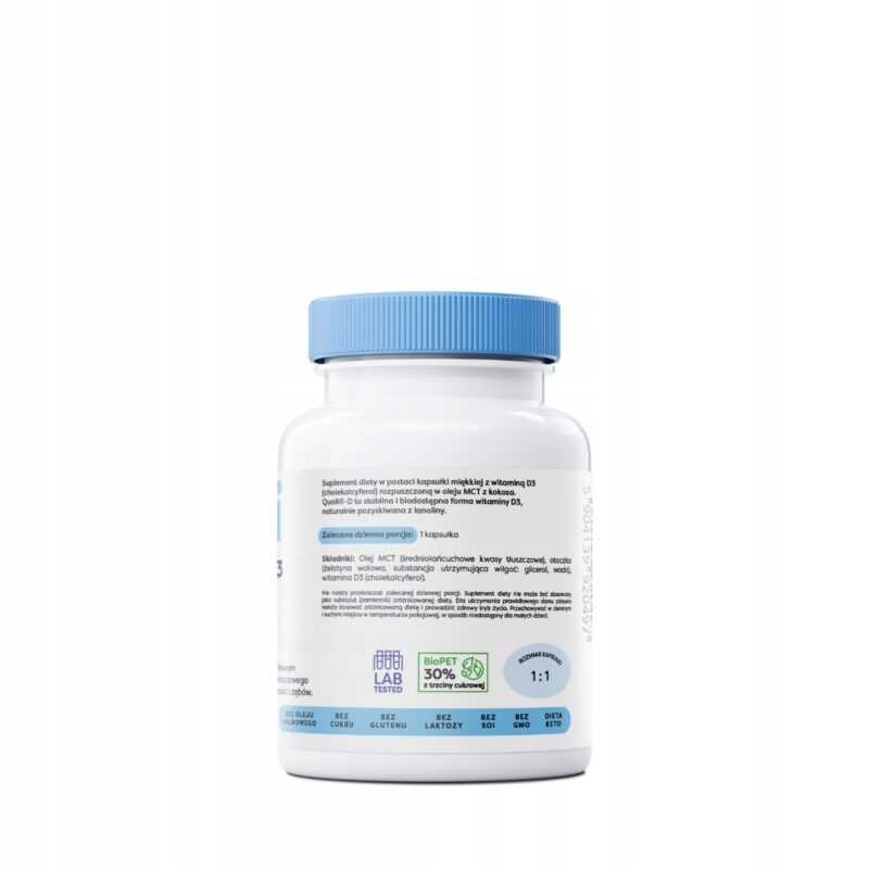 Suplement diety w postaci kapsułki miękkiej z witaminą D3 (cholekalcyferol) rozpuszczoną w oleju MCT z kokosa. Quali®-D to stabilna i biodostępna forma witaminy D3, naturalnie pozyskiwana z lanoliny.