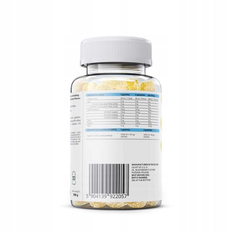 Suplement diety w postaci żelek zawierających witaminę D3 (cholekalcyferol), z naturalnym aromatem cytrynowym.